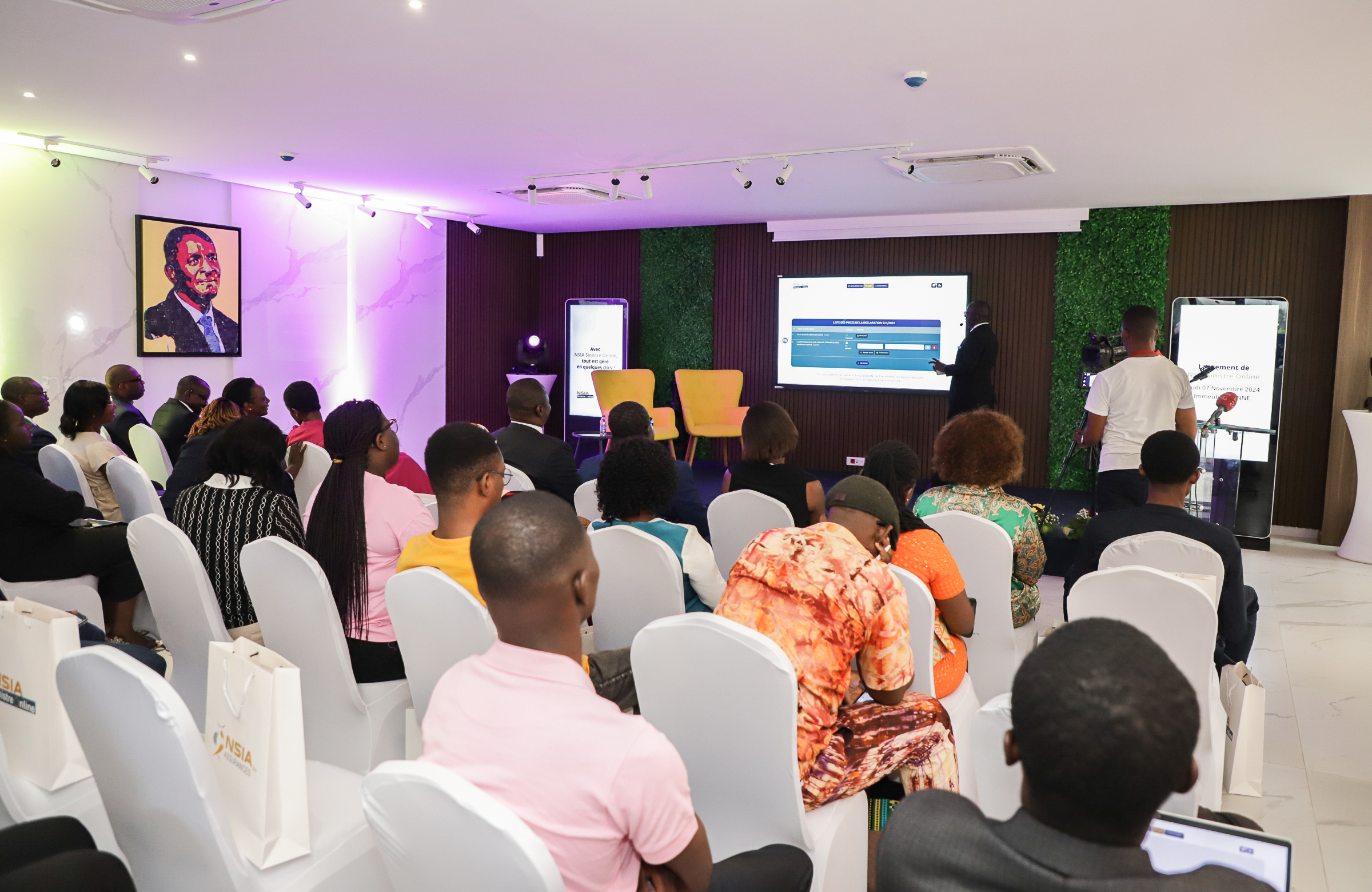 La cérémonie de lancement de « NSIA Sinistre Online » s’est déroulée dans une ambiance conviviale et professionnelle. L'événement, structuré pour refléter la vision client de NSIA, a débuté par un mot de bienvenue de Mme Anastasie Méledje, Directrice de l’Expérience Client, suivi de témoignages de clients ayant testé la plateforme en avant-première. La présentation technique a été assurée par M. Joël Kacou, Manager Prestations, qui a démontré les étapes intuitives de déclaration de sinistre et de suivi des dossiers.